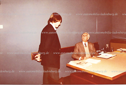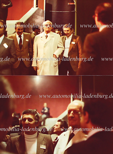 Konvolut 2 original Farbaufnahmen Enzo Ferrari mit Prof. Silvio Garattini, Gründe und Präsident des weltberühmten Pharmakologischen Instituts „Mario Negri“ in Mailand, beim Werksbesuch in Maranello, je 10x15cm