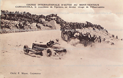 1932, Postkarte „Course International d´Auto au Mont-Ventoux“, Rudolf Caracciola auf Alfa Romeo 8C 2300, 9x14cm