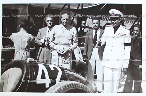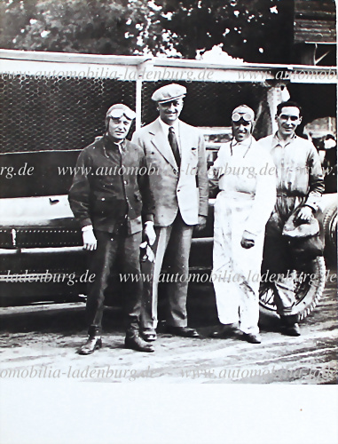 Original s/w Aufnahme (Archivabzug 50er Jahre), Enzo Ferrari mit Baconin Borzacchini, Tazio Nuvolari und Eugenio Sienna, 24x18cm, gestempelt „DuFoto Roma“