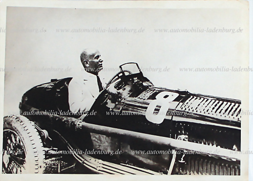 1932, original s/w Aufnahme Benito Mussolini im Cockpit des Alfa Romeo P3 Rennwagens von Tazio Nuvolari (GP Italien 1932), Villa Torlonia in Rom, 13x18cm, gestempelt „Fotvedo“