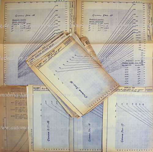 Konvolut 14 Seiten aus dem Nachlass von Giovanni Battista Guidotti, darunter Blaupausen / technische Zeichnungen Alfa Romeo 158 & 159, u.a. Geschwindigkeit des Fahrzeuges (158) mit verschiedenen Übersetzungen und Reifen, datiert 03.05.1950; Geschwindigkeiten Alfa Romeo 158C, datiert 05.07.1946;... mehr