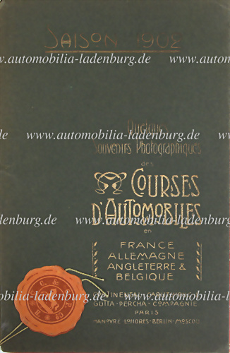 Saison 1902, kordelgebundene Broschüre "Courses d´Automobiles" (Frankreich, Deutschland, England und Belgien), darunter Ergebnisse und Bilder der Rennen in Nizza mit Sieger Stead auf Mercedes - Simplex (erst im September 1902 wurde der Name „Mercedes“ für die Daimler Motoren Gesellschaft gesetzlich... mehr