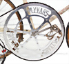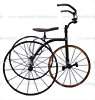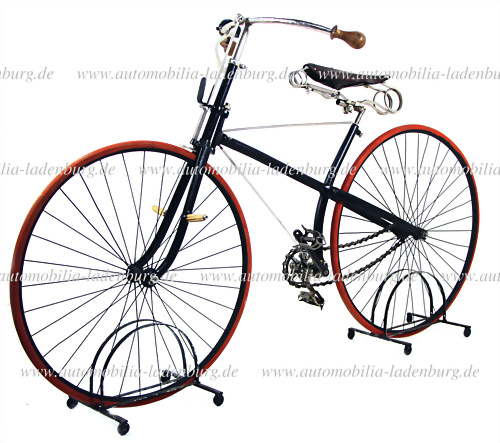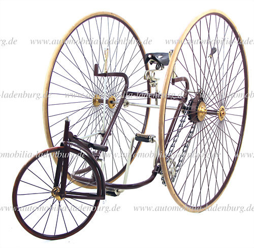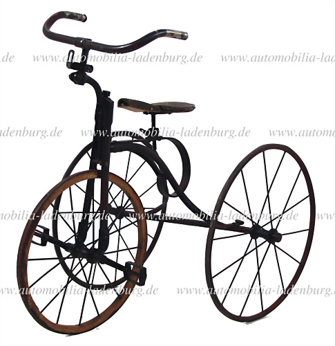 1877, konstruiert von James Starley (1831–1881), im Auftrag von Königin Victoria dem britischen „Vater des Fahrrads“. Stahldreirad mit Kettenantrieb, Kettenspanner und Differential auf der linken Seite, Bronzenabe mit Radialspeichen und Vollgummireifen, Lenkung durch Drehen eines Spaltgriffes mit... mehr