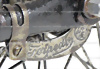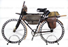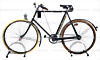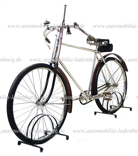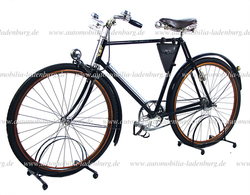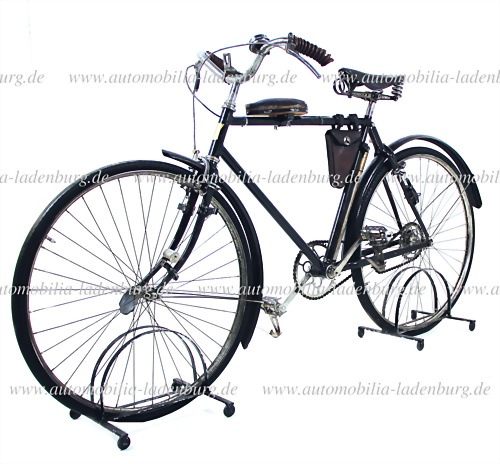 1914, Militär-Herrenrad mit Ersatzbereifung aus Stahlspiralfedern, eingefasst in Stahlband, Stempelbremse und Rahmen-Nr. 63152, ausgestattet mit Militärausrüstung: Gewehr, Lampe, Trinkflasche, Säbel, Decke, Fernglas, Besteckkasten, Spaten, Kaffeedose, Gepäckträgertasche, Oberrohrmilitärtasche,... mehr