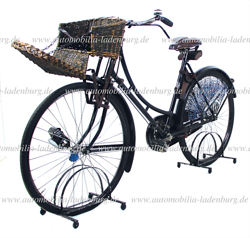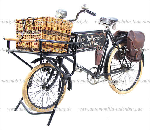 1938, Transportrad des Fleischermeisters Karl Wagner aus Weimar, Rahmen-Nr. 18562, mit offenem Transportkasten und Korb, Gepäckträgertaschen, Werkzeugtaschen, Dynamo mit Lampe, Langbeinschaltung Biala 600 und Originallackierung, 28 Zoll — Dürkopp wurde in Bielefeld gegründet und war im späten 19.... mehr