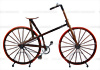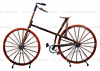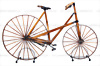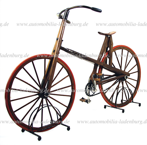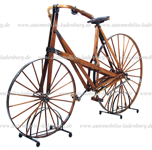 1870, Tretkurbelrad aus Holz mit Sattel auf Lederriemen, Holzrädern mit Eisenbereifung, Holzpedalen, Hinterrad-Klotzbremse, Bronze-Gleitlagern und nicht originaler Lenkstange, Vorderrad 100 cm (39 Zoll), Hinterrad 90 cm (35 Zoll), Länge 190 cm, Lenkerhöhe 130 cm