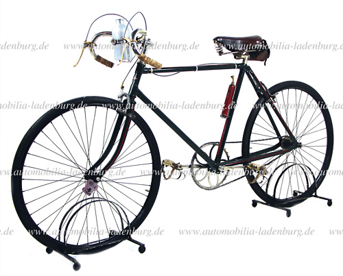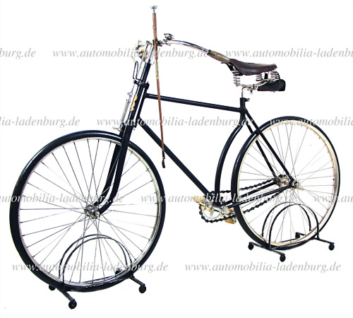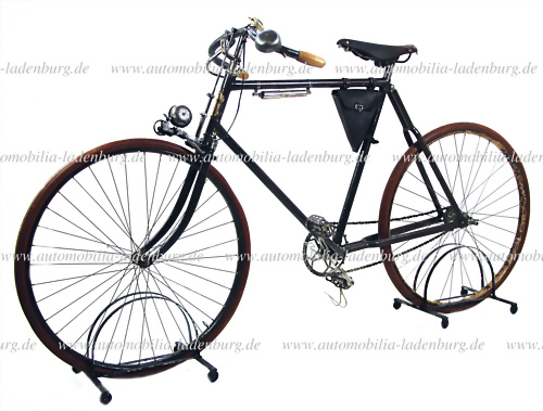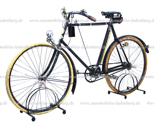 1898, Kreuzrover mit Stahlrohrrahmen, Radialspeichenrädern mit Vollgummireifen, Löffelbremse, Originalsattel, Fußauflage, Pedale nicht original, Vorderrad 74 cm (30 Zoll), Hinterrad 75 cm (30 Zoll)