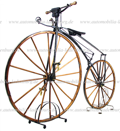 1864, Original-Tretkurbelrad mit Seriennummer 1762, schmiedeeisernem Rahmen, Klotzbremse mittels Seil auf das Hinterrad, Holzspeichenrädern mit Eisenbereifung, Bronze-Gleitlagern, original Sattel auf Blattfederaufhängung, eichelbeschwerten Pedalen und Lenkertasche, Vorderrad 108 cm (42 Zoll),... mehr