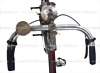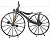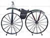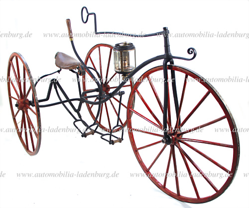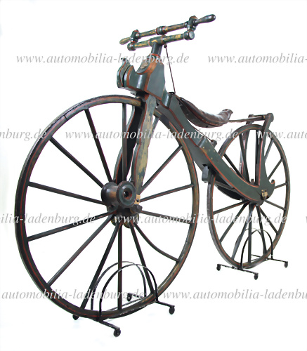 1856, original Padamotiv-Tricycle, mit Doppelhinterradantrieb über die Füße und die rechte Hand, die gleichzeitig die Bremse bediente, schmiedeeisernem Rahmen, Holzspeichenrädern mit Eisenbereifung, original Sattel und Kutschenlampe, Gewicht 58 kg, Vorderrad 90 cm (35 Zoll), Hinterrad 95 cm (37... mehr