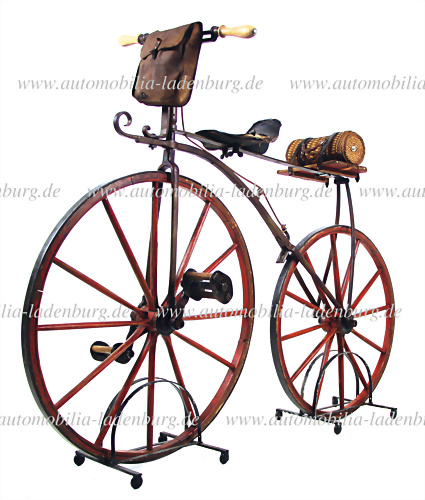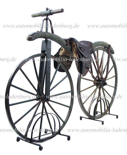 1877, Hochrad mit nach oben gedrehtem Lenker, Stahlrohrrahmen, Brozenabe, dicken Speichen auf Holzfelgen mit Eisenbereifung, original Sattel mit gebrochenem Holz auf Blattfeder sowie offenem Lenkkopf, Vorderrad 40 Zoll