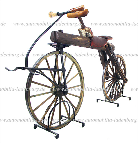 1830, Laufrad als lenkbare Laufmaschine aus Holz mit Fußauflage, Holzrädern mit Eisenbereifung und Lenkung über Lenkstange auf das Vorderrad, Holzgriffen und nicht originalem Hinterrad, Vorderrad 70 cm (28 Zoll), Hinterrad 70 cm (28 Zoll), Länge 160 cm, Lenkerhöhe 100 cm