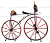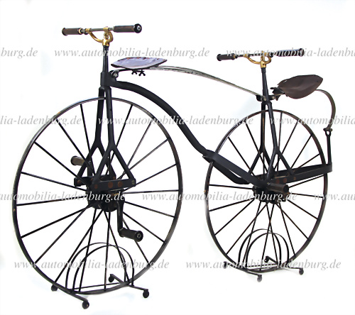 1872, Velociped-Tandem „Caroussel“, mit schmiedeeisernem Rahmen, 36-Zoll-Ganzmetallrädern, Bronzetretlager mit Freilauf, Bronzelenker und original Sattel auf Blattfederaufhängung, Gewicht 67 kg, Vorderrad 92 cm (36 Zoll), Hinterrad 92 cm (36 Zoll), Länge 200 cm, Lenkerhöhe 125 cm