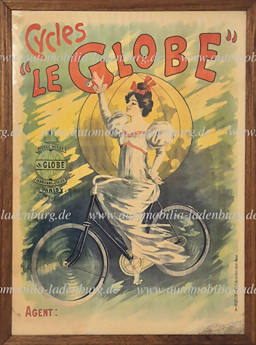 Um 1895, großes Lithographie Werbeplakat für "Le Globe" Fahrräder, Entwurf Clouet Emile, oben links numeriert N.29, Flecken an den unteren Rändern, Faltspuren, kleine Einrisse und mittig geklebt, dem Alter entsprechend guter Zustand, gerahmt hinter Glas 137,5x100 cm.