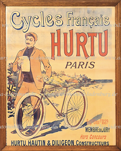 1889, großes Lithographie Werbeplakat für Hurtu Fahrräder, Motiv ist ein Karte lesender Radfahrer, Faltspuren und am oberen Rand geklebt, dem Alter entsprechend guter Zustand, gerahmt hinter Glas, 130x105 cm.