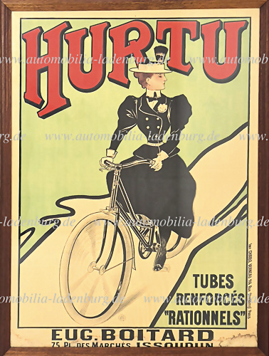 Um 1898, großes Lithographie Werbeplakat für Hurtu Fahrräder mit verstärkten Rohren, "Tubes Renforces `Rationnels´", gedruckt v. Charles Vernau, unten nachträglich bedruckt: "Eugene Boitard, 75 Place des Marches, Issoudun", Faltspuren und Wasserflecken am unteren Rand, dem Alter entsprechend guter... mehr