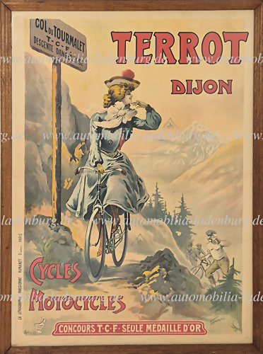 Um 1903, großes Lithographie Werbeplakat für Terrot Fahrräder und Motorräder, eine Frau erklimmt den Tourmalet auf einem Terrot Rad mit 2-Ketten Gangschaltung, mit welcher Terrot die Goldmedaille im TCF gewann "Concours TCF Seule Medaille D`Or", Entwurf Francisco Tamagno, Faltspuren, dem Alter... mehr