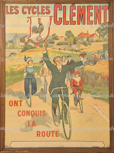 Um 1890, großes Lithographie Werbeplakat für Clement Fahrräder "Ont Conquis La Route", Faltspuren, kleine Einrisse an den Rändern und Wasserflecken am unteren Rand, dem alter entsprechend guter Zustand, gedruckt v. E. Bougard, gerahmt hinter Glas 160x117,5 cm.