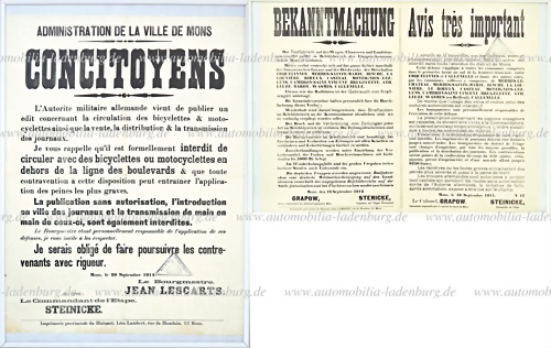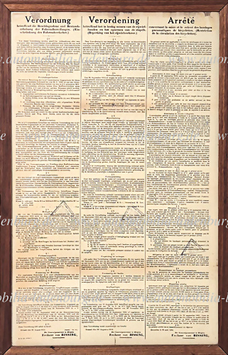 1914, Aushänge der Stadtverwaltung v. Mons, über das Fahrverbot zwischen den Orten innerhalb des Bezirkes, "...ebenso ist es Verboten Zeitungen zu Drucken und zu verteilen..." mehrsprachig, Faltspuren Flecken und kleines Loch, dem Alter entsprechend guter Zustand, gerahmt hinter Glas 71x51 cm.