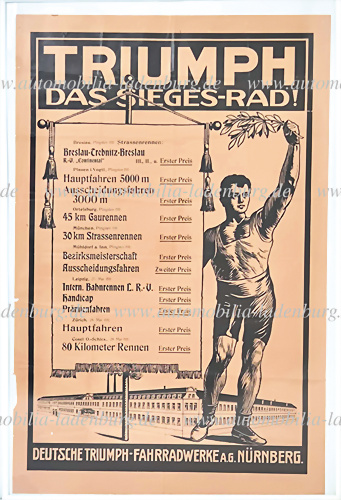 1911, Fahrrad Rennplakat "Triumph das Siegerrad", mit Rennerfolgen auf Triumph Rädern, Faltspuren und kleine Einrisse, dem Alter entsprechend guter Zustand, gerahmt, 93x62 cm.
