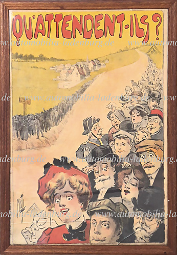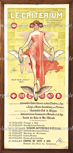 1907, großes Lithographie Werbeplakat für die Automobilveranstaltung "Le Criterium", unter der Schirmherrschaft des Königs von Belgien, organisiert von verschiedenen Automobilclubs, 12-21 Juli 1907, Klebereste, kleinere Löcher eine Ablösung und Wasserflecken, gerahmt auf Presspahn 156x70,5 cm.