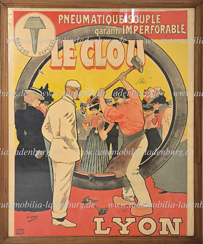 Um 1899, großes Lithographie Werbeplakat für undurchdringliche Reifen "Pneumatique Souple garanti Imperforable, Entwurf v. H. Gray, Faltspuren und Klebestellen, de, Alter entsprechend guter Zustand, 161x128 cm.