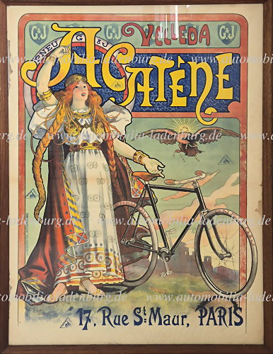 Um 1896, großes Lithographie Webeplakat für das kettenlose Fahrrad "Velleda Acatene", sowie G&J Reifen, Entwurf L. Baylas Faltspuren, Flecken an den Rändern, sowie Einrisse, dem Alter entsprechend guter Zustand, gerahmt hinter Glas, 167,5x127,5 cm.