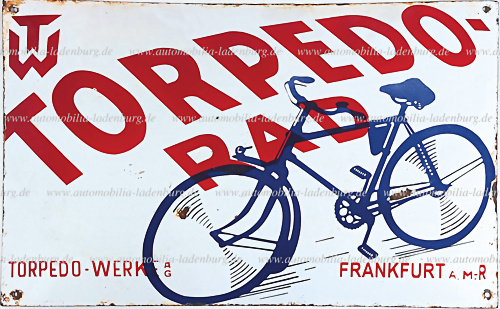 1920er Jahre Torpedo-Rad Emailleschild, 40x60cm, kleinere Beschädigungen an Rändern und mittig, dennoch guter Zustand