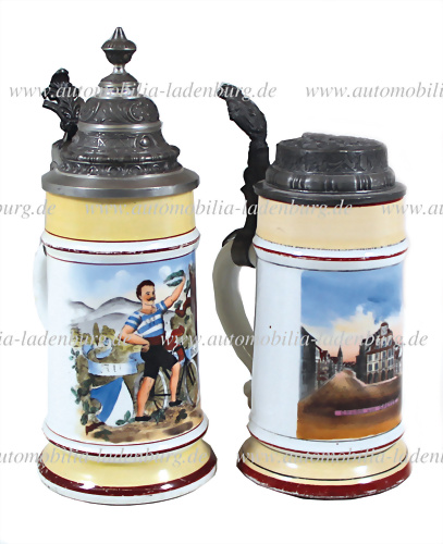 Um 1900, Konvolut 2 tlg. darunter Radfahrerkrug "All Heil!", Höhe 25cm, ohne Markung, mit Zinndeckel, sowie Krug "Gruss aus Speyer" mit Dreirad Motiv auf Zinndeckel, dem Alter entsprechend guter Zustand