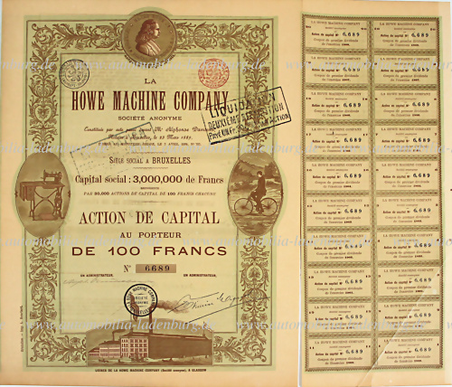 1889, Wertpapier 100 Francs Howe Machine Company Brüssel, 37x28cm, guter Zustand