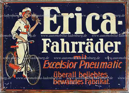 1920/1930er Jahre, lithographiertes Blechschild, " Erica-Fahrräder mit Excelsior Pneumatic überall beliebtes, bewährtes Fabrikat", Hersteller: Union Werke Radebeul - Dresden, Lackabplatzer, 41,7x30,6cm