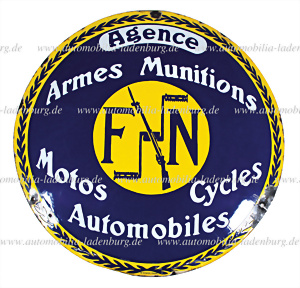 Emailleschild, "Agence FN", "Armes Munitions und Motos Cycles Automobiles", Lackabplatzer (siehe Foto), Durchmesser 50cm