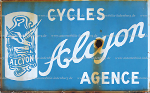 1930er Jahre, Emailleschild "Cycles Alcyon Agence", hergestellt in Belgien, als Händlerschild gedacht mit beidseitigem Motiv, Lackabplatzer auf Vorder- und Rückseite, 25x40x5,5cm