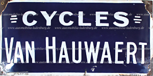 1929, Emailleschild "Cycles Van Hauwaert", Hersteller Emaille Koekelberg Belgien, 25x50cm, Lackabplatzer an Ecken