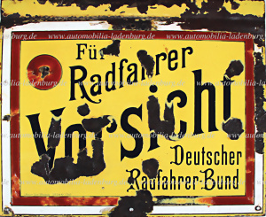 Emailleschild, "Für Radfahrer Vorsicht - Deutscher Radfahrerbund", Hersteller C. Robert Dold Offenburg (D.R.G.M. No. 77247), 35x43cm, mit einigen Lackabplatzern sowie wohl fehlender DRB Plakette oben links