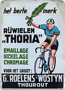 Emailleschild "het beste merk Rijwielen "Thoria" G. Roelens - Wostyn Thourout", 43x30cm, Rand teils nachgemalt