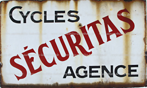 1930er Jahre, Emailleschild "Cycles Securitas Agence", Motiv doppelseitig zur Montage als Händlerschild, 30x50x5cm, leichte Lackabplatzer und Verfärbungen am Rand