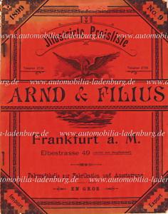 1899, Arnd & Filius "Illustrierte Preisliste" No.9 für "Fahrradtheile zur Fabrikation und Ausstattung" u.a. mit Lampen, Pedalerie, Maschinen, etc., Einriss an der Bindung, dem Alter entsprechend guter Zustand.