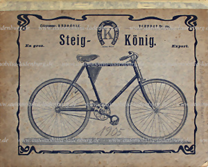 1905, Preisliste für Königräder und und Zubehörteile, innen u.a. mit Illustrationen des Werkes, dem Alter entsprechend guter Zustand.