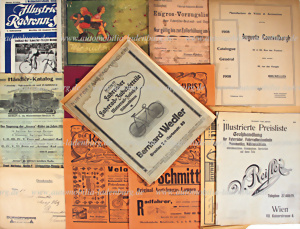 Um 1910, Konvolut 15 tlg. Preislisten, Zeitschriften und Schriftferkehr für Fahrräder, Teile und Zubehör, darunter z.B.: Auguste Coeckelbergh Katalog 1908, V. Reifler Preisliste 1913, 3 Ausgaben "Der Radtourist der Automobilist" 1902 & 1903, sowie Schriftverkehr über Proma Pedalerie, etc., tw. mit starken Gebrauchsspuren
