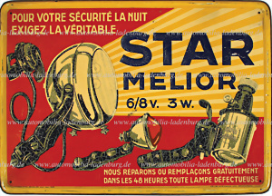 1933, Metall Werbeschild für "Star Melior" Lampen und Dynamo, rissiger Lack, 24,5x35 cm.