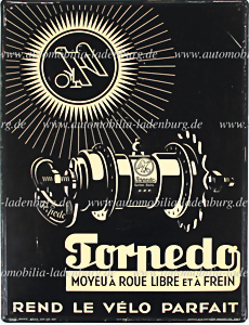 1937, Blech Werbeschild Torpedo Freilaufnarbe, Rostspuren am linken Rand und Gebrauchsspuren, dem Alter entsprechend guter Zustand.