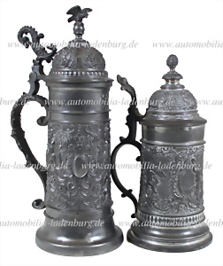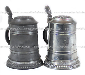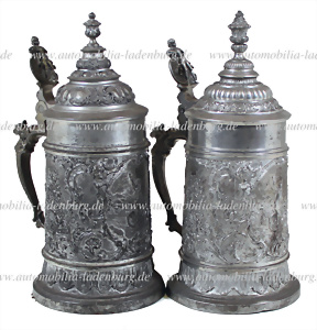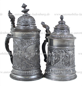 Um 1900, Konvolut 2 tlg. Radfahrer Zinnkrüge, darunter Krug 2. Preis Herbstrennen 1895 Hans Schmid, Münchner Männer Radfahrerclub, mit beflügelter Frauenfigur als Relief und Adler Figur am Deckel, ca. 30 cm., sowie Krug mit angelndem / jagendem Engel Relief, ca 24 cm.