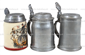 Konvolut 3 tlg. Radfahrerkrüge, darunter Zinnkrug mit Widmung, Zinnkrug mit Widmung für 25 Jahre Mitgliedschaft im A.R.B., sowie Steinzeug Krug "All Heil" A.R.B.