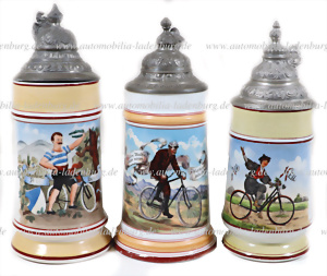 Um 1900, Konvolut 3tlg. Radfahrer Bierkrüge, darunter ein Krug gewidmet und datiert auf 1906, sowie zwei Weitere mit Schriftzug "All Heil", einer davon mit Riss, ca. 23 cm.
