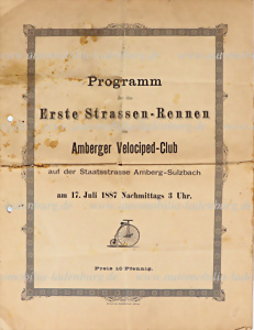 1887, Programmheft zum "Ersten Strassen-Rennen", datiert auf den 17.07,1887, innen Doppelseite, mit Startaufstellung für 4 Unterrennen und je den Zeiten der 4 bestplazierten, mit Lochungen, Faltspuren, Flecken und Einrissen.