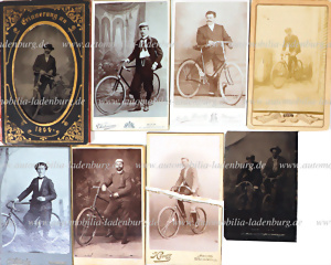 Um 1900, Konvolut 8 tlg. original s/w Kabinettaufnahmen, von Radfahrern, darunter " Erinnerung an 1899", ein Positiv auf Blech, sowie Aufnahme C. Schröder Wien, etc. eine Aufnahme gerissen, versch. Formate, deutliche Gebrauchsspuren, weitere Details entnehmen Sie bitte unserem Katalogbild