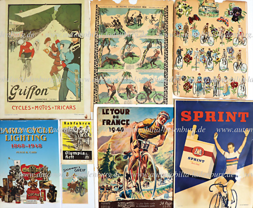 Um 1890/1910, Konvolut über 150 tlg. darunter zahlreiche Verkaufs- und Fahrradkataloge versch. Hersteller, Werbe- Zeitungsausschnitte, Radfahrerausweise, Wertpapiere, Rechnungen, Schriftverkehr, etc. von Herstellern wie z.B.: Adler, Linke & Junkers, Bernh. Stoewer, Arminius, Victoria, etc., sollte... mehr