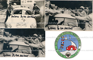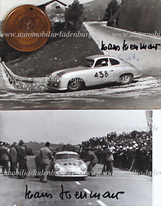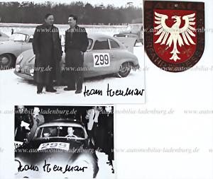 2. Internationale Rallye Travemünde 1952, Konvolut 3 handsignierte original s/w Aufnahmen, Hans Herrmann und Erwin Bauer auf Porsche 356 1500 super „split window“, 8x13cm, dazu Teilnehmerplakette