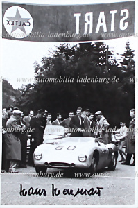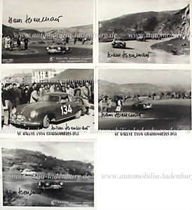 Lyon Charbonnieres 1953, Konvolut 5 original handsignierte s/w Aufnahmen, Herrmann / von Frankenberg auf Porsche 356 1100 „split window“, Kennzeichen W59-3453, die beiden belegten den fünften Platz im Gesamtklassement. Porsche Rennleiter Huschke von Hanstein holte den damals 26 jährigen Hans Herrmann daraufhin in die Rennmannschaft, 18x24cm