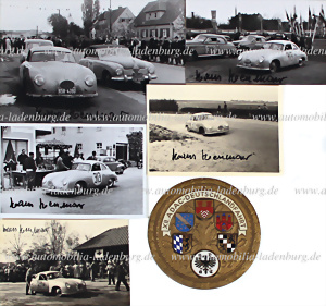 XII ADAC Deutschlandfahrt 1952, Konvolut 6tlg., darunter 4 original s/w Aufnahmen (teilw. handsigniert), dazu Teilnehmerplakette, Herrmann / Gräter wurden Klassensieger auf Porsche 356 1500 super „split window“, 8,5x12,5cm